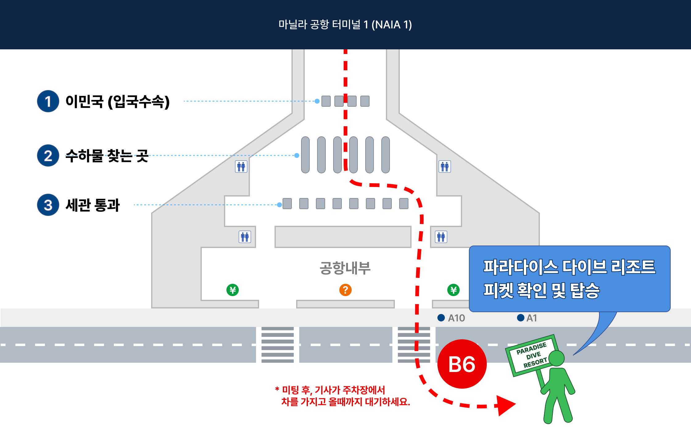 첫번째 횡단보도 - 왼쪽 - B6 (PARADISE DIVE RESORT 확인) + 기사미팅